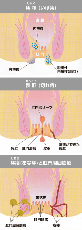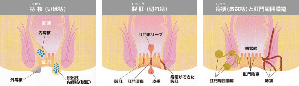 「痔」とはこれら三つの総称です。それぞれを見分け適切な治療方針を立てる為には正しい診断が必要です。