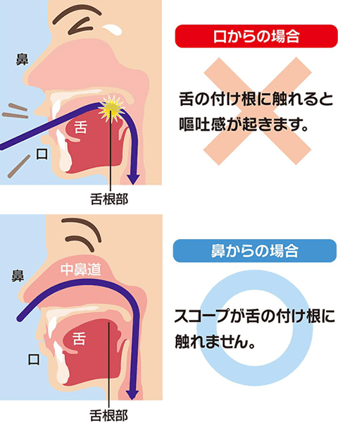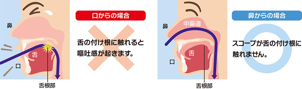 口からの胃カメラでは舌の根元部分に触れて嘔吐反射(オエッとなる)が起こり辛い検査となってしまいます。