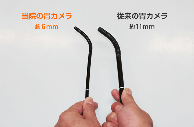 当院では6mm前後の胃カメラを使用し従来の約半分に細くなっており苦痛を和らげます。