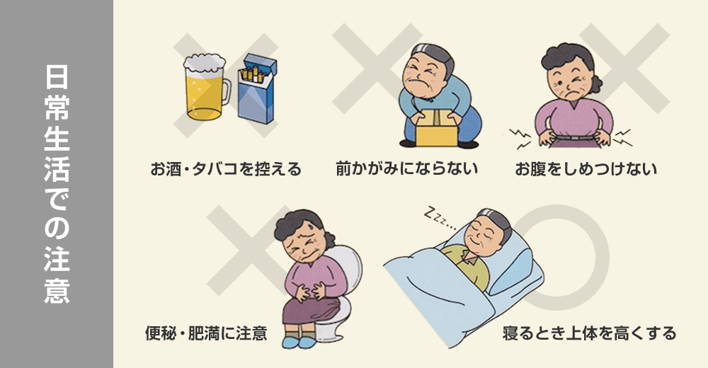 喫煙、アルコール、チョコレート、脂肪分の多い食事、仰向け寝、右側臥位