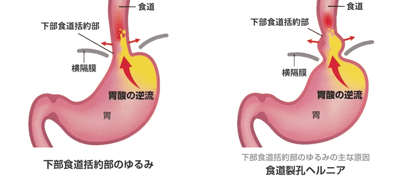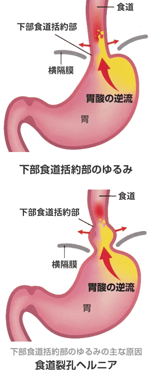 この食道と胃の境目を閉める下部食道括約筋の機能に異常が生じると、強酸である胃酸が食道へ逆流してしまいます。食道粘膜は胃粘膜と異なり粘液分泌によるコーティングなどの防御機能が低く、食道の粘膜が荒れて、粘膜を痛め炎症を起こす病気を逆流性食道炎と言います。
